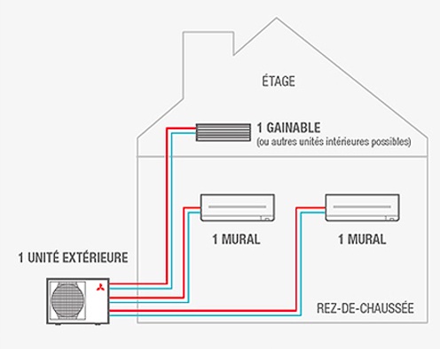 Pour les ménages ayant besoin d'un refroidissement de plusieurs pièces simultanément (différentes chambres, salon, bureau). Plusieurs climatiseurs sont installés à l’intérieur et sont reliées à une seule unité extérieure. Tout en garantissant le contrôle et le monitoring de la température de chaque pièce.